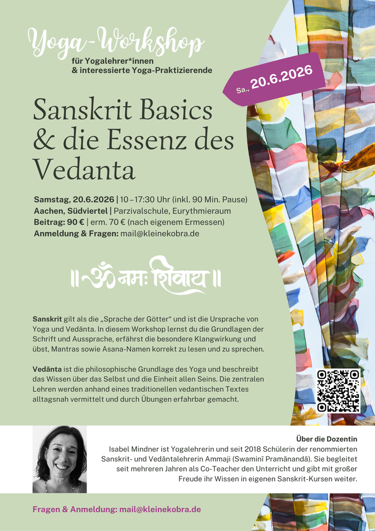 Entdecke die Ursprache des Yoga und die Weisheit des Vedānta: Lerne die Grundlagen von Sanskrit, erlebe die Kraft von Klang und Aussprache und tauche zugleich in die zeitlosen Lehren über das Selbst und die Einheit allen Seins ein – verständlich vermittelt und praktisch erfahrbar.